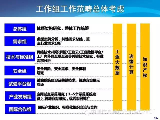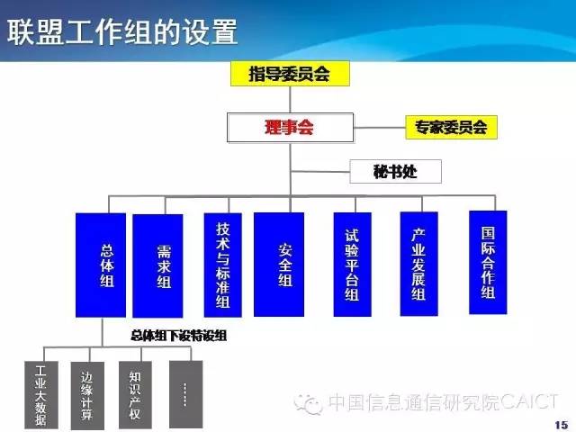 现在联盟一共有七个组,总体组、需求组、技术与标准组、安全组、试验平台组、产业发展组、国际合作组。在总体组下面设了三个特设组,工业大数据、边缘计算和知识产权,也是希望能够对这些重点的方向汇聚力量快速突破。