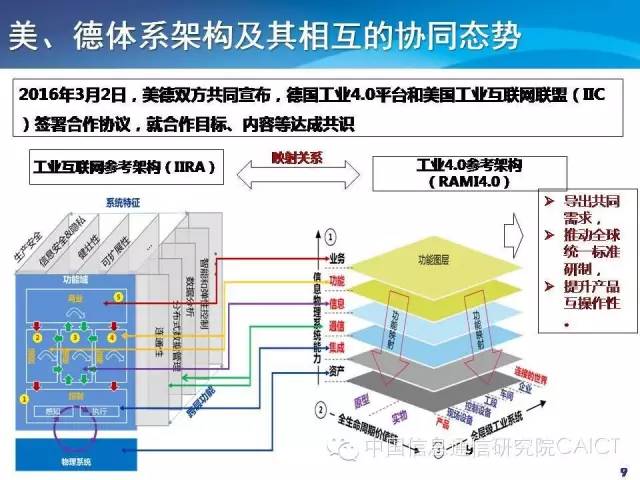 2015年美国IIC和德国工业4.0都发布了参考架构,两个组织也在进行对接。3月2号,德国工业4.0和美国IIC签署了合作协议,进行深度的合作。参考架构做了一个映射,左边是IIC的架构,从功能视角可以看到有物理、控制、运营、应用、商业,跨层的功能和系统特征。右边是德国的参考架构,基本是三大集成的理念,纵向的,端到端的全生命周期管理。从功能的角度做的一个映射,双方签署了合作意向会进一步推动将来的合作,针对具体的测试床和具体的标准,IIC和德国工业4.0计划5月初在芝加哥开会进一步讨论。