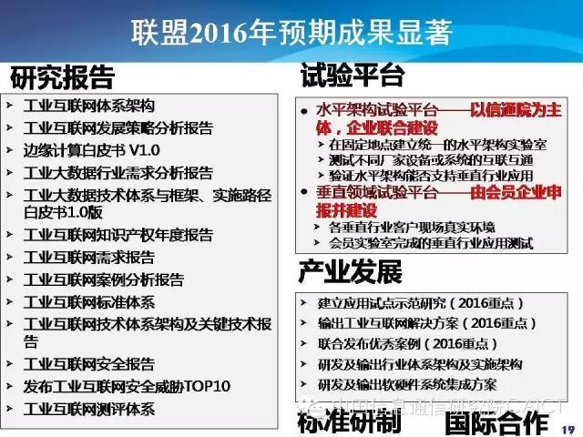 联盟2016年的成果显著。一个是试验报告,成熟以后会在联盟的网站上发布。试验平台会搭建水平架构和垂直领域试验平台。产业发展也有很多工作要做,包括试点示范、解决方案的输出、优秀案例的发布,另外有推动标准研制和国际合作的工作。5月份左右开始有成果的输出,大家可以多关注。