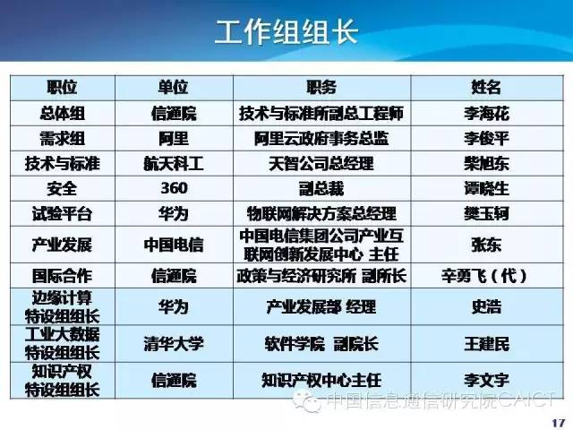 我担任总体组的组长,阿里的是需求组,航天科工是技术与标准,360是安全,试验平台是华为,中国电信是产业发展,信通院是国际合作,华为是边缘计算组组长。