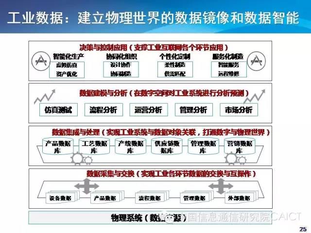 目前工业互联网体系架构还在研究,希望在5月份的时候能够发布体系架构。这个体系架构包括了定义,怎么看待工业互联网。目前达成了一些共识,首先数据是非常重要的核心,它涉及很多环节,包括数据采集,在微观层面数据实时的集成处理,保证工业处理的实时性。往上有数据的建模分析,再结合各个层次,车间工厂企业层面利用数据实现运营生产的优化。另外还要考虑数据在大网上的闭环。工业互联网大的体系架构就是把数据作为核心的要素,跟物理的连接,包括应用采集层面。