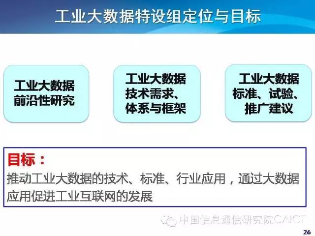 工业互联网产业联盟下面有大数据特设组,希望通过特设组快速推动工业大数据的研究。包括整体性的研究、需求框架、标准试验。