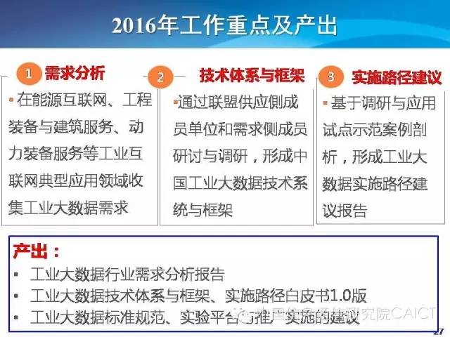 这是具体的成果,一是发布大数据行业需求分析报告,对具体行业数据应用情况和需求进行分析。二是针对工业大数据给出体系框架,包括后续的实施路径,发布白皮书。还有一个重要的工作,特设组的工作是将来要制定什么样的工业大数据的标准,开展什么试验,开展什么验证内容,由哪些专门的行业来推动,会给出倾向性的建议。