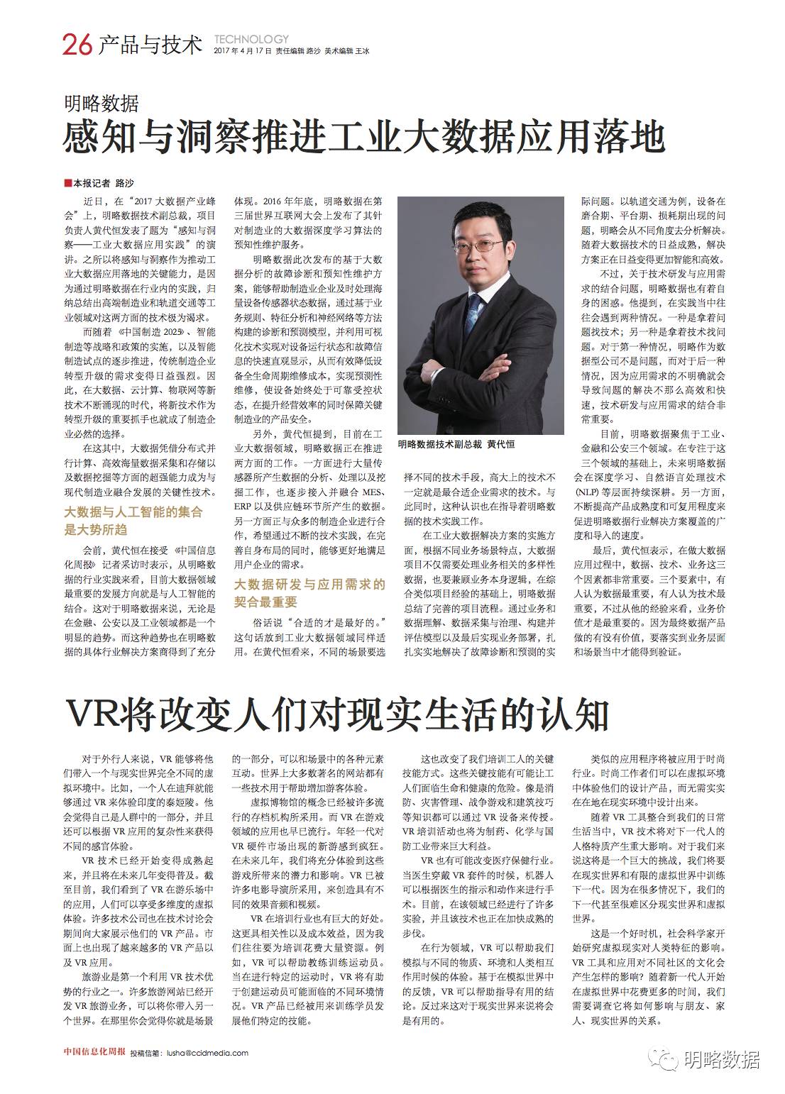大数据与人工智能的集合是大势所趋近日,黄代恒在接受《中国信息化周报》记者采访时表示,从明略数据的行业实践来看,目前大数据领域最重要的发展方向就是与人工智能的结合。这个对于明略数据来说,无论是在金融、公安以及工业领域都是一个明显的趋势。而这种趋势也在明略数据的具体行业解决方案商得到了充分体现。2016年年底,明略数据在第三届世界互联网大会上发布了其针对制造业的大数据深度学习算法的预知性维护服务。