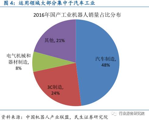 根据中国机器人产业联盟的数据,2016年上半年国产工业机器人应用行业进一步拓宽至农副食品加工业,酒、饮料和精制茶制造业,医药制造业,餐饮业等,较2014年增加6个行业中类、21个行业小类;