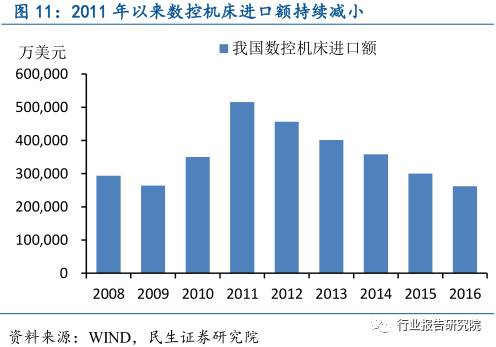 高端数控仍处于起步阶段。我国目前处于数控机床的智能化技术起步阶段,现阶段大部分的数控机床还不具备智能化功能,自主生产的数控机床主要以中低端产品为主,高端数控机床(数控系统)主要依靠进口,2016年我国数控机床进口额约26亿美元。