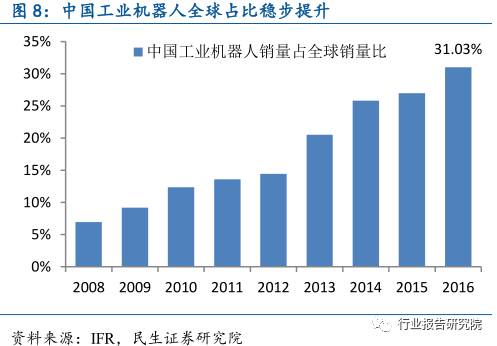 根据IFR初步统计数据,2016年我国工业机器人销量已高达9万台,较2015年增长31.28%,显著高于全球工业机器人14%的销量增速,其中中国工业机器人销量占全球销量比重以达31%,我国工业机器人的需求有了显著增长,成为全球的重要市场。