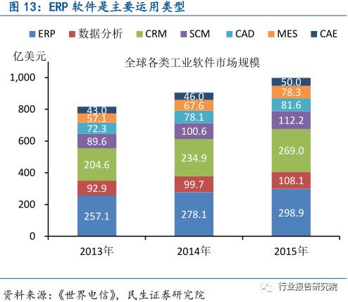 其中ERP软件产业格局相对稳定,SAP和Oracle两家企业占据主导,属于一线ERP软件,Infro、Sage、Microsoft隶属二线;在CRM领域中,Salesforce 占据全球CRM市场第一位,且发展迅速,其成功来自基于SaaS的云服务模式;