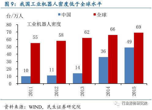 我国工业机器人密度仍偏低。从工业机器人的普及使用情况看,截止2015年我国每万人拥有工业机器人的数量已升至49台,虽然仍显著低于全球每万人69台,但较2011年我国每万人10台已有显著提升,目前水平已接近2010年时全球的每万人50台。