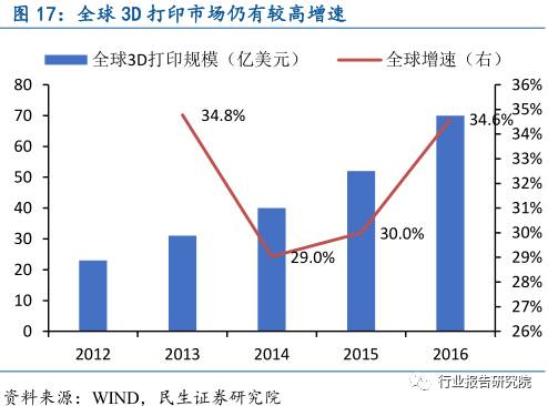 3D打印市场规模保持高速增长。Gartner发布的数据显示,2016年全球3D打印市场规模为70亿美元,至2020年将达到212亿,未来五年复合增速为32%。尽管增长显著,但事实上3D仅占到全球制造业市场的0.04%,市场潜力还未完全开发。