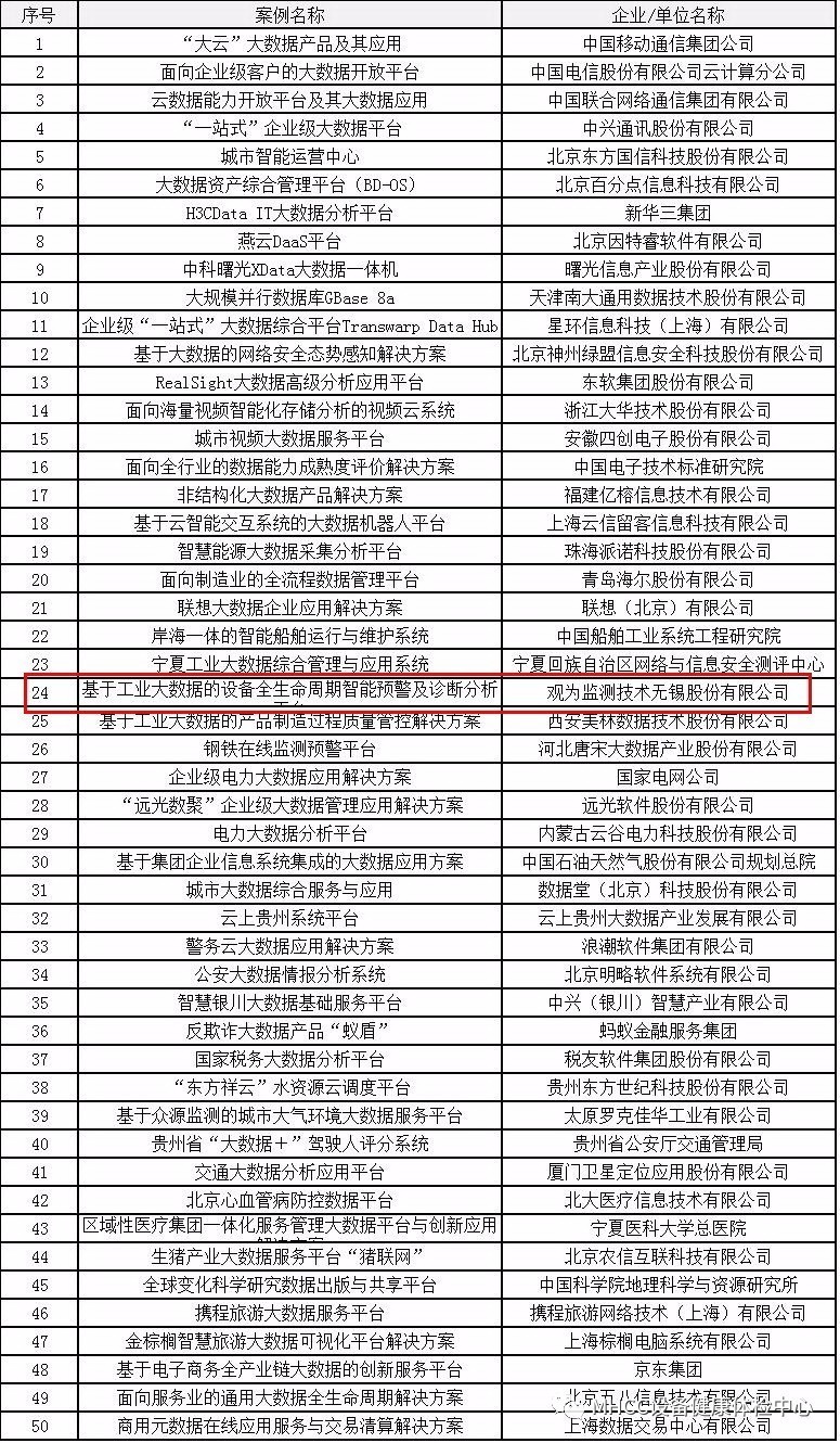 2017年4月,国家工业和信息化部公示了《大数据优秀产品、服务和应用解决方案案例集》入选名单,观为监测基于工业大数据的设备全生命周期智能预警及诊断分析平台凭借着领先的技术优势和行业实践能力成功入选,充分展示观为监测在大数据领域的产品研发实力,进一步证明该平台在实现智能诊断与处理、进行大规模数据管理和深层数据挖掘的核心竞争力。
