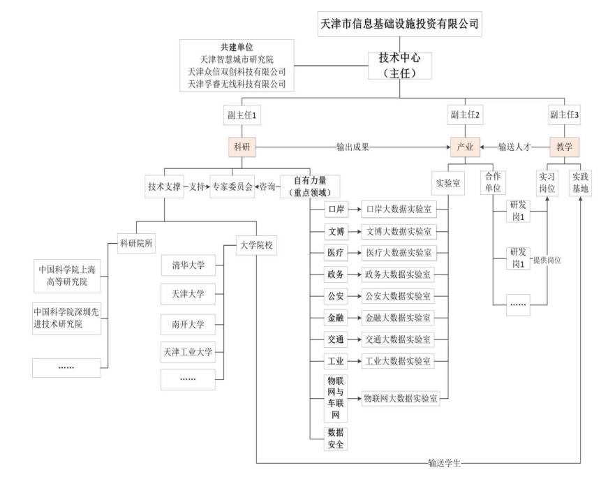 智慧城市大数据工程技术中心设置有科研、产业、教学三大板块。科研板块聚合了中国科学院上海高等研究所、中科院深圳先进技术研究院等多家科研院所的科研资源,同时设立专家委员会提供技术支撑。产业板块由信投创业共同体内的多家科技型企业、合作伙伴以及孵化中的创业团队共同组成,以市场为导向提供课题和科研项目,实现技术成果的转化变现。教学板块则联合天津大学、天津工业大学等多所知名高校,以实践基地的形式提供研发力量和人才储备。