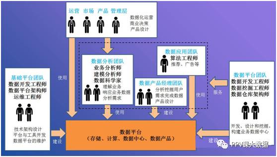 包括三种人群:基础平台团队对 hadoop、spark、storm等各类大数据技术都非常熟悉,负责搭建稳定、可靠的大数据存储和计算平台。数据平台团队主要负责各类业务数据进行清洗、加工、分类以及挖掘分析,然后把数据有组织地存储到数据平台当中,形成公司的数据中心,需要团队具有强大的数据建模和数据管理能力。数据产品经理团队主要是分析挖掘用户需求,构建数据产品为开发者,分析师和业务人员提供数据可视化展示。