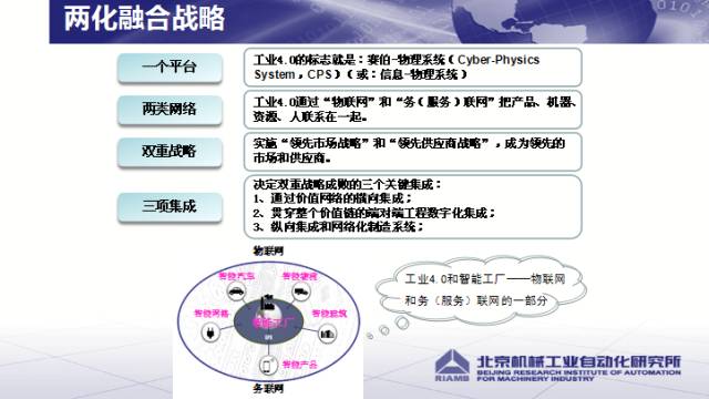 工业4.0的核心就是一个平台、两类网络、双重战略和三项集成。一个平台就是大家经常说的信息物理平台;两类网络就是指物联网和务联网;双重战略就是领先市场战略和领先供应商战略;最主要是三项集成,通过价值网络的横向集成、数字化集成和纵向集成。