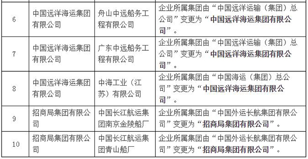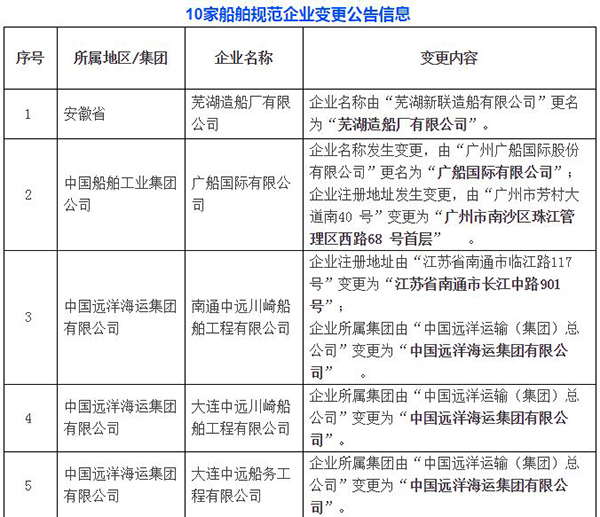 工信部同时公布了10家船舶规范企业变更公告信息、6家符合《船舶行业规范条件》企业名单。