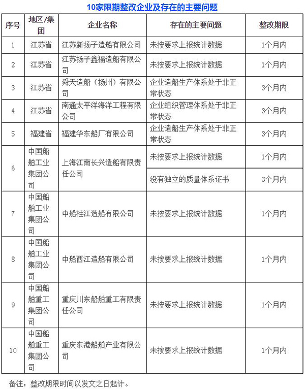 这10家企业存在的主要问题分别是,未按要求上报统计数据;企业造船生产体系处于非正常状态;企业组织管理体系处于非正常状态;没有独立的质量体系证书。