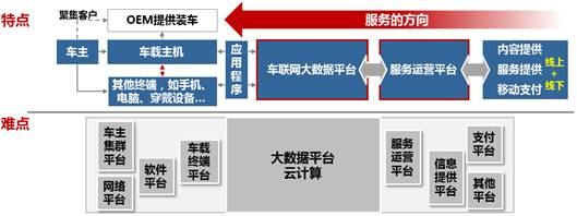展望明天,大数据将全面助推汽车产业变革。诸如客户信息与特征、消费习惯、驾驶行为等都将为未来汽车设计、生产、制造、服务以及保险等带来指导性建议。而大数据信息平台将成为未来汽车产业的顶层结构,以控制产业的智能运转。因此,数据服务交互管理平台会变得至关重要,这将通过大数据平台与服务运营平台的相互交融而形成,并构成未来产业运营的核心。一方面,通过车联网平台最大限度获取车主、车辆以及交通等数据;另一方面,通过服务运营平台为车主提供内容、服务和移动支付,包括线下和线上。在此过程中,车主集群平台、网络平台、软件平台、车载终端平台、服务运营平台、信息提供平台、支付平台以及其他各种相关平台,将最终形成大数据服务交互管理平台,并基于云计算快速处理各种信息。这些不同平台的搭建及其整合是未来汽车大数据产业的难点所在,但同时也是必然的发展方向,具体可参见图2。
