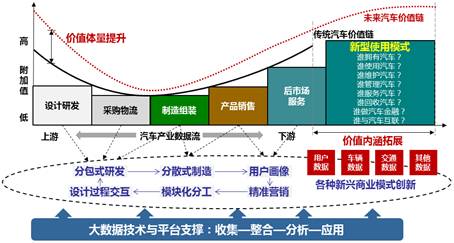 当前,能源、互联与智能三大革命,正在引发汽车产业的全面重构和汽车文明的重新定义,汽车的产品形态、制造体系、创新模式与产业生态都将和过去大不相同。汽车产业从造车端到用车端的整个价值链条的各环节,都将持续产生数据并利用数据不断自我优化,从而与大数据紧密地联系在一起。如图1所示,通过用户数据、车辆数据、交通数据以及其他相关数据的收集、整合、分析与应用,包括分包式研发、分散式制造、用户画像、精准营销、模块化分工以及设计过程交互等在内的各种相互交织、彼此影响的商业模式创新,全都成为可能,不仅将使从汽车设计研发、采购物流、制造组装到产品销售及后市场服务的全产业链附加值得到程度不同的全面提升,而且还将极大地扩展汽车产业原有的价值内涵,为汽车产业带来无穷多种的全新可能和前所未有的巨大机遇。