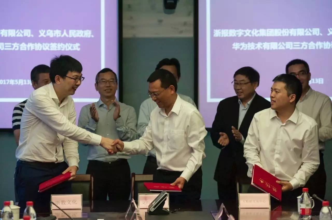 5月13日下午,浙报数字文化集团股份有限公司、义乌市人民政府、华为技术有限公司三方在浙江省杭州市签订《战略合作协议》,未来将共同探索大数据和人工智能技术在传统产业转型升级中的进一步应用。
