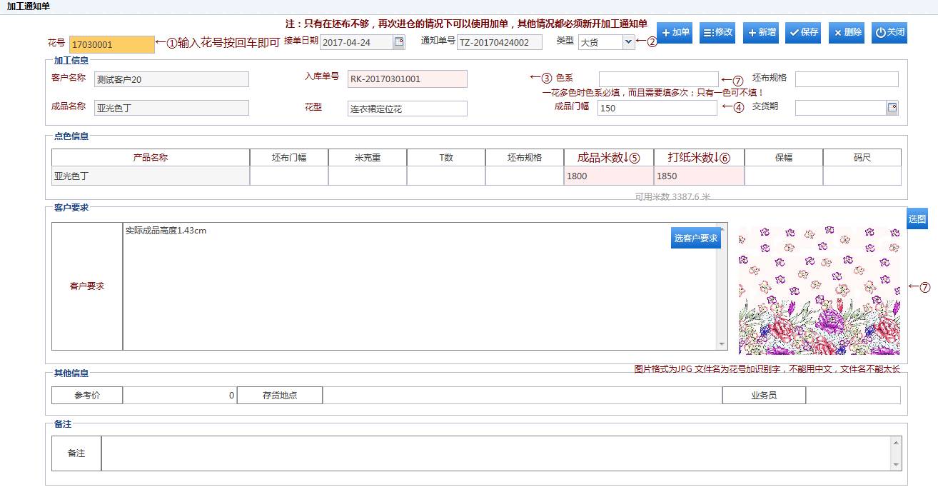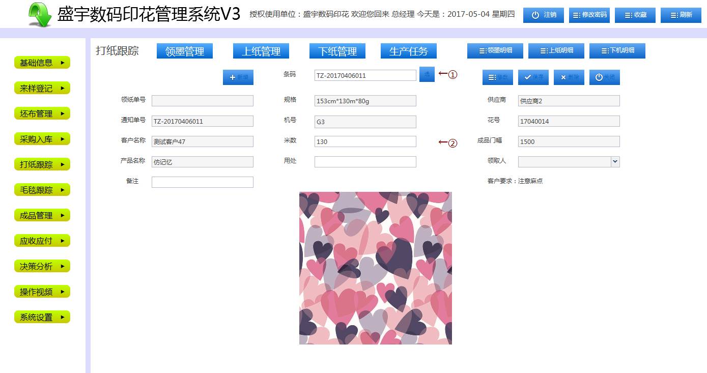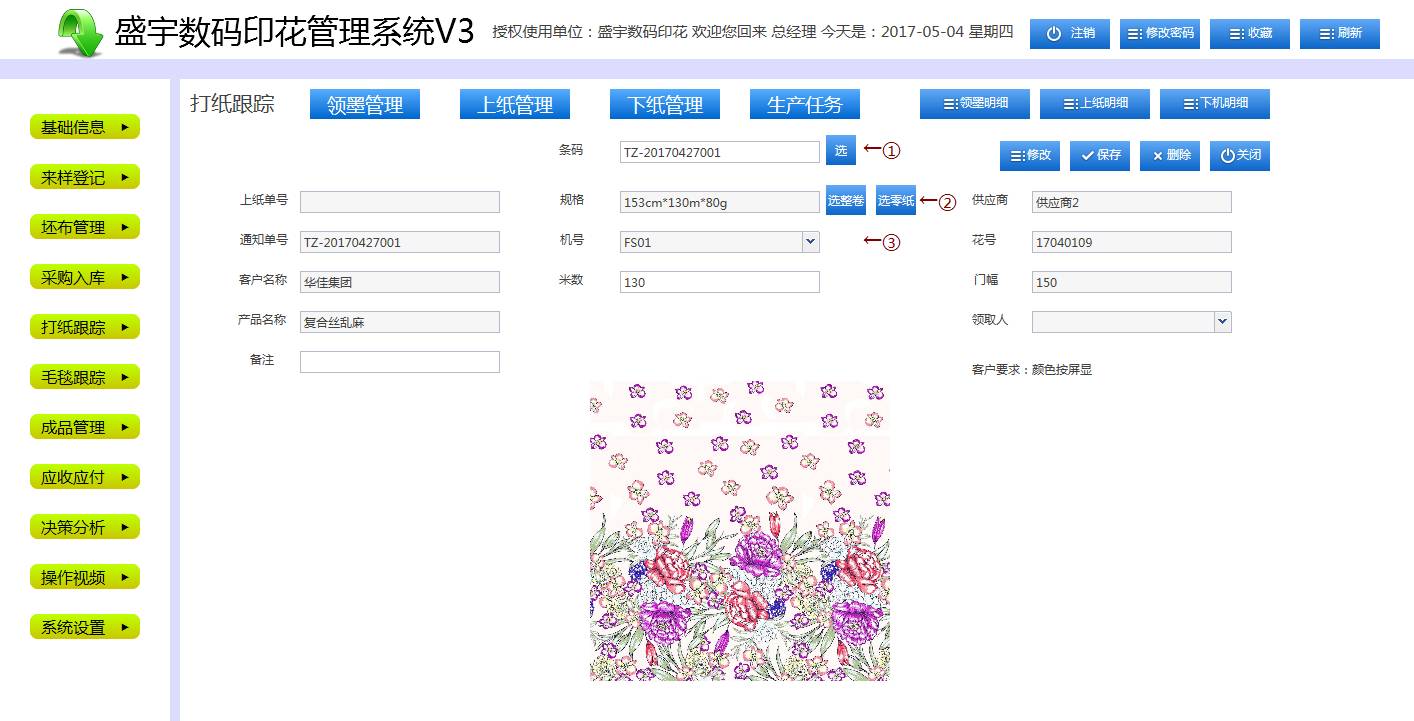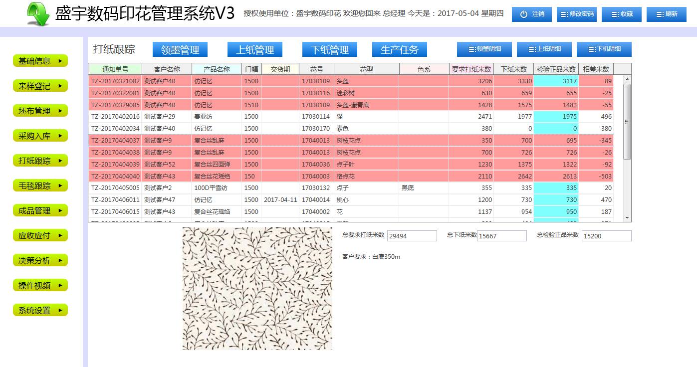 生产任务全程实时跟踪、花型图片全程实时显示(有效的防错)、一键批量生成对账单、自动生成花号等,支持手机、平板电脑等远程操作及查看,为数码印花企业量身定制、把控整个生产流程。