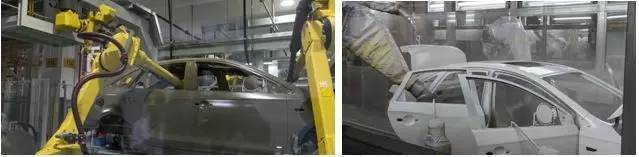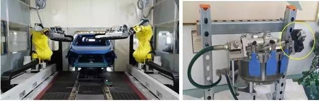 相比于其他专业,在涂装车间采用自动喷涂,除了可以提升效率、稳定质量外,更有消除污染工位作业、提高涂料利用率和实现节能环保的价值。现有汽车涂装生产线底部密封绝大多数都通过改造实现自动化,粗细密封和油漆内喷也成为主流新建线的标配。采用车底密封机器人,可以使送排风量降低80%。在普遍已经实现机器人外喷的基础上采用机器人内喷涂料,在节约涂料、减少风量和减少污染的同时可实现80%以上的循环风应用,既稳定施工参数又使得喷漆室排风量大幅减少,使得新建先进涂装线得以实现所有喷漆(包含水性漆)废气的全部净化处理,该成套方案比人工喷涂解决策略的整体能耗和排放降低了60%以上。机器人内表面涂胶和喷涂如图2所示。