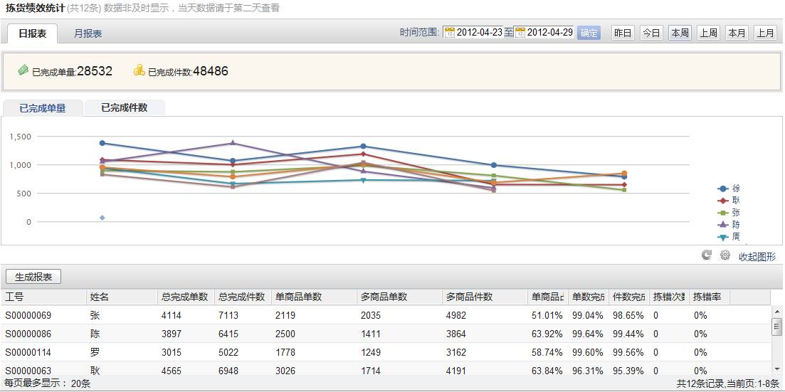 电商企业管理者还可以在云起ERP中查看拣货作业绩效的日报表和月报表,以及每个拣货人员的绩效情况。