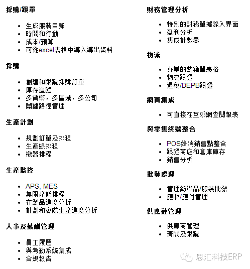 思汇为製衣业提供一套灵活的企业资源计划方案,可帮助服装领域各种规模的公司企业实现更加卓越的生产运营。从企业后台到公司管理层、从工厂仓库到商铺店面、从电脑桌面到移动终端 ——思汇科技助力用户和企业更加高效地整合资源协同协作,同时更加有效地获取商业洞见,在竞争中保持领先地位。思汇科技的应用实施及顾问服务能够使多家客户实现生产高效,运营盈利,持续的自我调整以及稳步增长。。