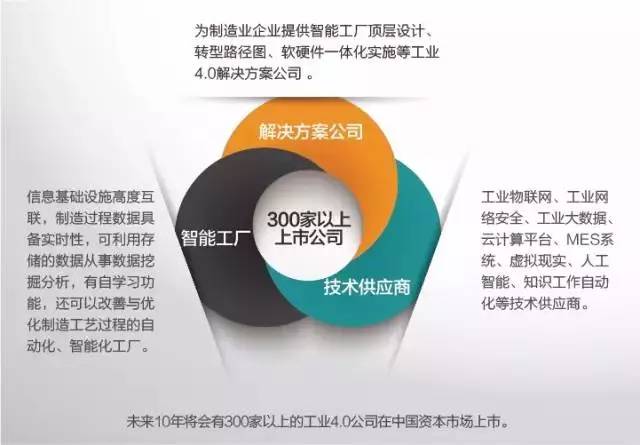 德国提出的“工业4.0”中的九大技术支柱包括工业物联网、云计算、工业大数据、工业机器人、3D打印、知识工作自动化、工业网络安全、虚拟现实和人工智能。这九大支柱中会产生无数的商机和上市公司。