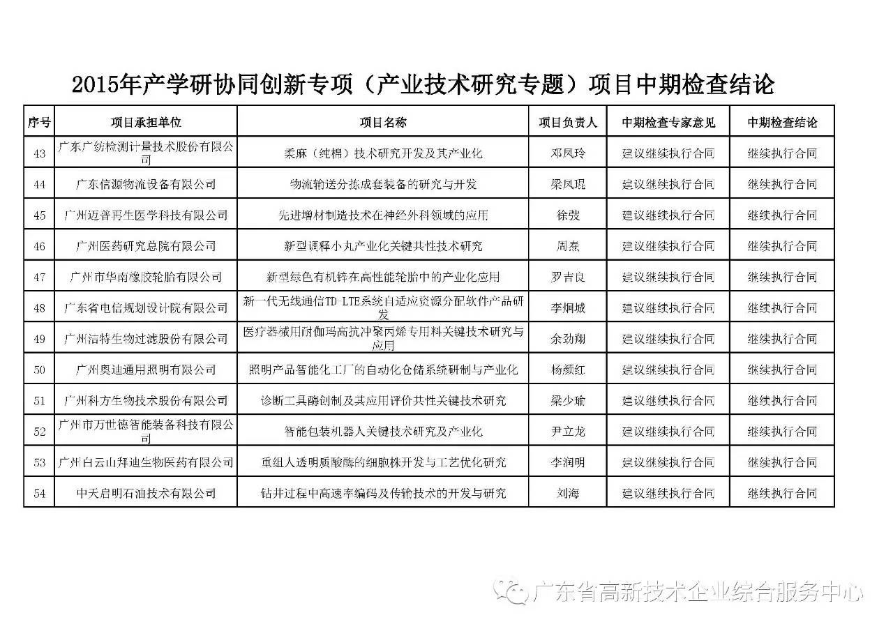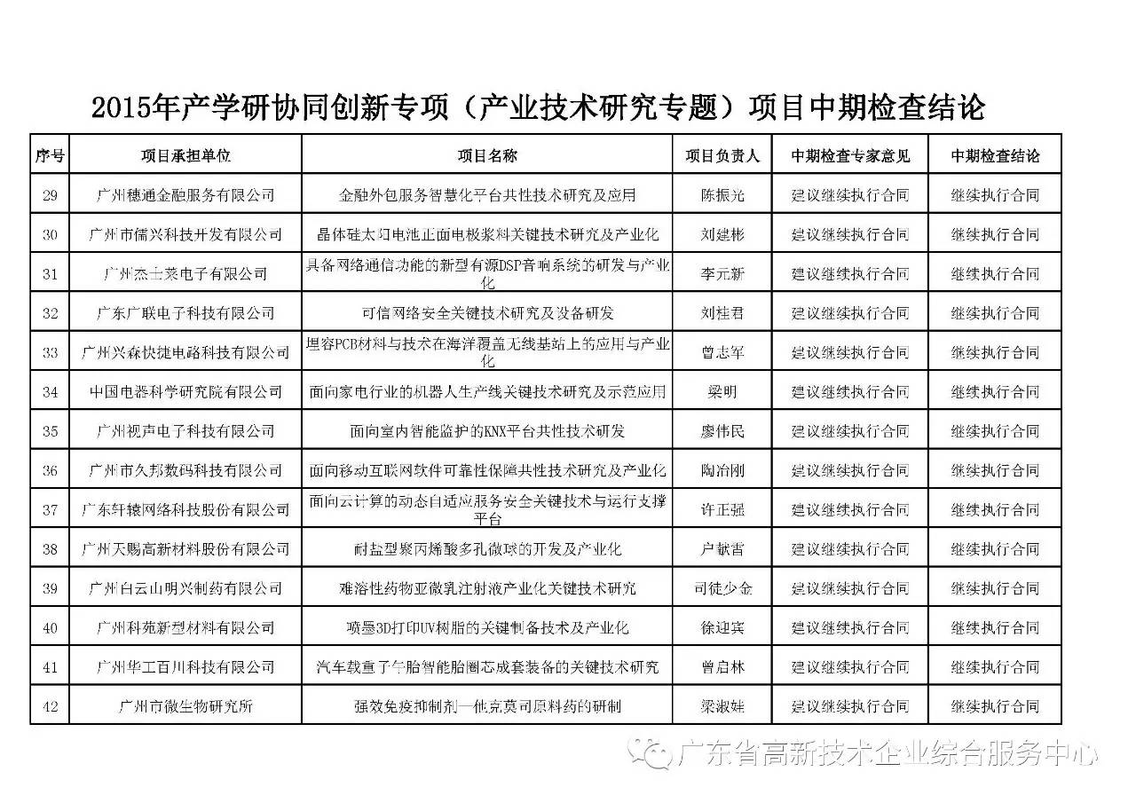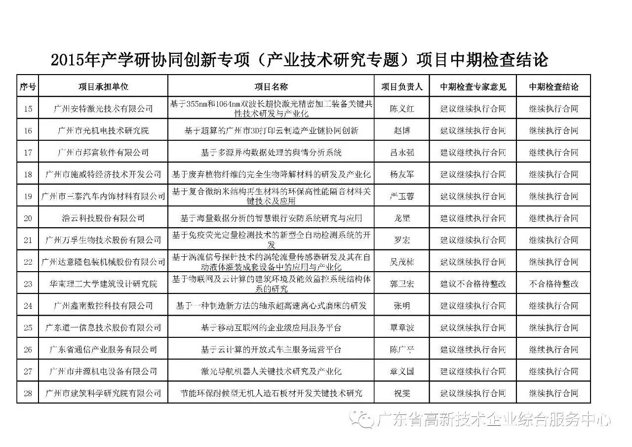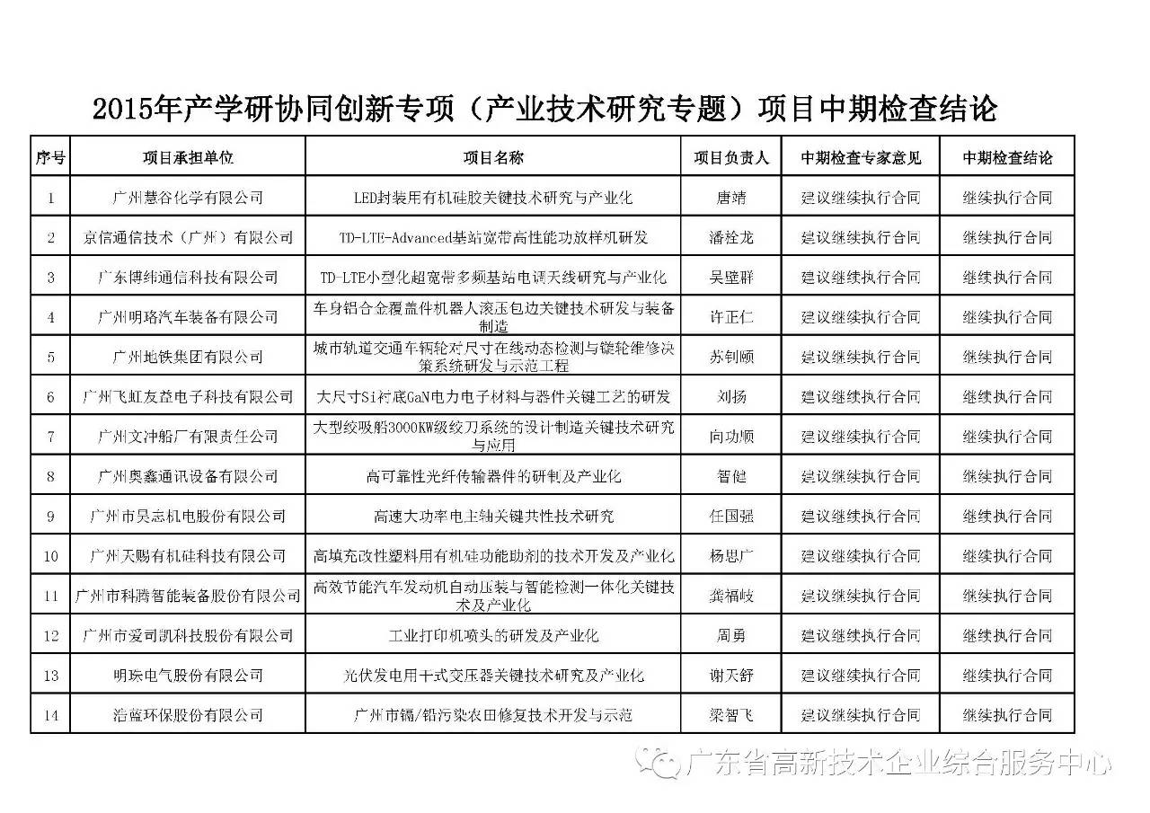 根据《广州市科技计划项目管理办法》(穗科创〔2015〕6号)有关规定,现对2015年产学研协同创新专项(产业技术研究专题)项目中期检查结论予以公开(见附表)。