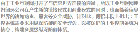 何积丰院士毫不讳言,直言现在的工控系统面临着严峻的安全形势,这包括五个方面:一是随着硬件元器件的可靠性越来越高及冗余技术的使用,安全问题的矛盾主要集中于软件,软件安全性面临严峻形势;二是工控信息安全标准需求强烈,标准制定工作正全面推进;三是随着自动化系统 IT 化,传统边界防护难以满足工业控制环境;四是行业内尚未形成统一气侯,需要整合自动化与信息安全公司优势,带动产业全面发展;五是工控安全防护技术虽然正迅速发展并在局部开始试点,但距离大规模部署和应用有一定差距。