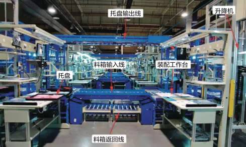 组装每一个产品需要的所有物料按照订单拣选出来并放置在配料箱中。为了提高配料效率,常用部件通常选用流利式货架进行存放拣选,非常用部件则放置在搁板货架上。价值较高的CPU则处于相对封闭的区域内,由工人将其拣选并放到从封闭区域内穿过的输送线上。有赖于快速的补货,有些零部件(如机箱)不需要放在货架上,直接从集装箱移至输送线旁进行配料。工人按照订单信息进行原材料配备以后,还会对其PPID码(产品料号识别码)进行一一扫描,并与系统订单信息进行比对,只有信息一致时系统才会让其继续进入下一环节。