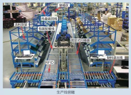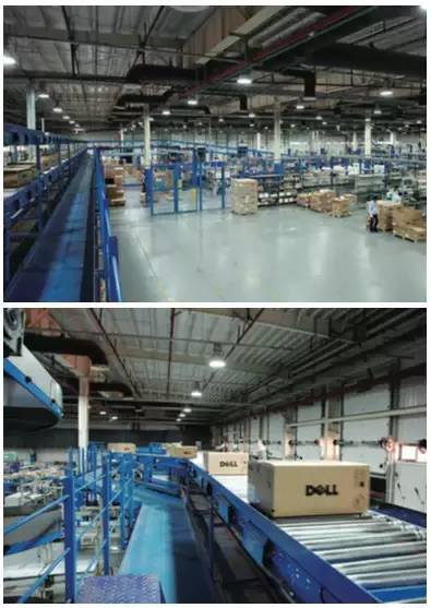 戴尔的一套PC生产物流系统包括以下设备:900米零压力积放电滚筒输送机(1200支电滚筒)、4台堆垛(卸垛)机、2套螺旋升降机、3套AB PLC总线控制系统、2套工控机监控系统、2套PTM屏显拣选系统、RFID读写器11套、SICK扫描器12套、摆动轮分拣机11台、HANEL垂直回转库1套、各种计量及检测仪器、自动化专机、自动测试系统、自动贴标机、半自动助力吸吊机。这一完整的工业4.0生产物流系统,涵盖了信息系统、仓储物流技术装备、生产技术装备、自动化专机,生产效率达到500台/小时,输送分拣效率1500箱/小时。
