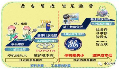 随着物联网、云计算、工业大数据的技术成熟,通过技术手段分析和预测设备故障成为可能,比如,我们可以提前一个月预测某台设备的会出现故障,那么我们只需提前一个月购买备件即可---这就是“预测性维护”(设备管理3.0)。