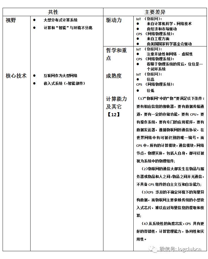 下表总结了主要的CPS 和IoT的共性和主要差异: