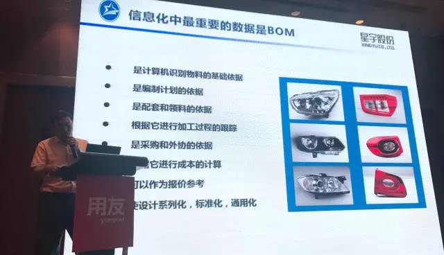 常州星宇车灯股份有限公司始建于1993年,通过不断成长与发展现已成为国内内资最大车灯生产企业,是德国宝马全球供应商。星宇车灯信息部部长鲁龙冠认为,信息化中最重要的数据是BOM,星宇车灯通过用友PLM与U8深度集成,建成精准共享的BOM, BOM清单可以轻松地在PLM与ERP中双向传递共享。同时,以项目管理模式来达成设计制造一体化也是用友PLM的一大主要特征;对于星宇而言一个车灯成品就是一个项目,项目管理囊括项目的所有阶段,在系统中包括产品结构、零部件管理、产品配置、变更管理、产品工艺管理,最后通过数据集成与接口快速准确送达至ERP。最后,鲁龙冠用一句话概括总结:用友PLM促进了星宇车灯整个公司数据的正确性、完整性和安全性。