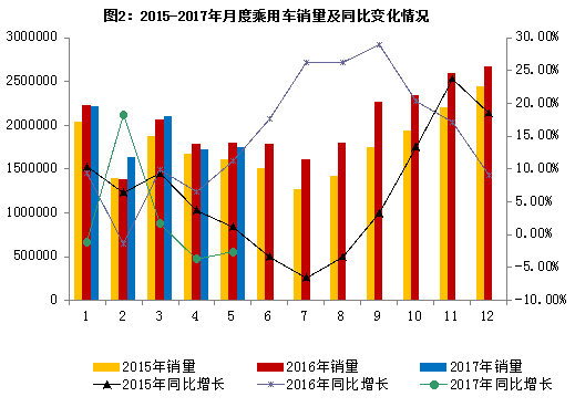 2017年5月,汽车市场保持平稳,汽车产量同比微增,环比略有下降,销量同比略降,环比小幅增长。1-5月,汽车产销同比均呈小幅增长,增幅比1-4月趋缓。