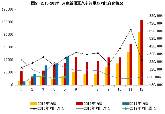 5月,新能源汽车产销分别完成5.1万辆和4.5万辆,同比分别增长38.2%和28.4%。其中,纯电动汽车产销分别为4.4万辆和3.9万辆,同比分别增长52.5%和49.0%;插电式混合动力汽车产销分别完成0.8万辆和0.7万辆,产销同比分别下降9.3%和28.3%。