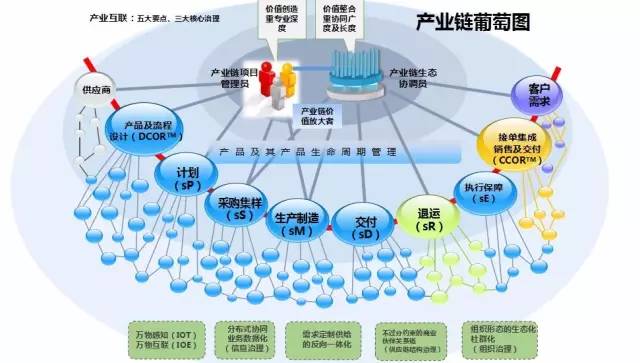 为了解释产业的意思,我画了幅图,将产业链上的十个关键的节点进行连接。产业互联网有比较长的价值流程,供应链主要从流程视觉来看企业以及链式专业化的企业集群;外部的价值链主要从企业的价值定位角度看网链上的企业;产业从宏观角度来看。但我们在分析一个产业的时候,我们既要看宏观,又要看微观。以前的产业是链,今天的产业已经形成网。