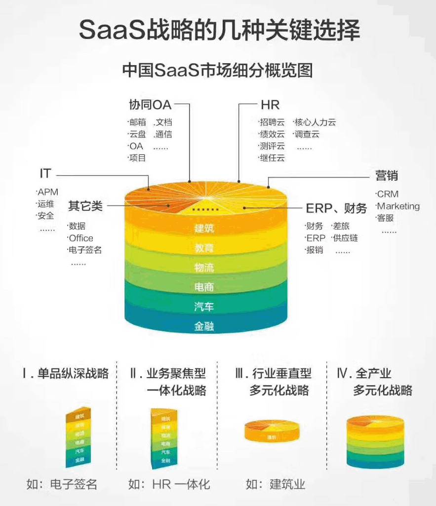 纪伟国将企业级软件的发展路径进行分类,按行业和业务角度来分,主要有4种,第一种是单品纵深,比如电子签名;第二种是业务聚集一体化,比如做HR软件;第三种是行业垂直多元化,比如建筑行业软件;第四种是全产业多元化,这只有SAP、甲骨文、用友这类公司才能做。