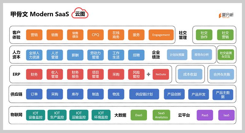 以上是甲骨文的云图,最上面的客户体验是CRM的升级版,更加突出客户体验和客户全生命周期,已经向前扩展到数字营销,向后延伸到财务,更重要的是有社交协作能力;