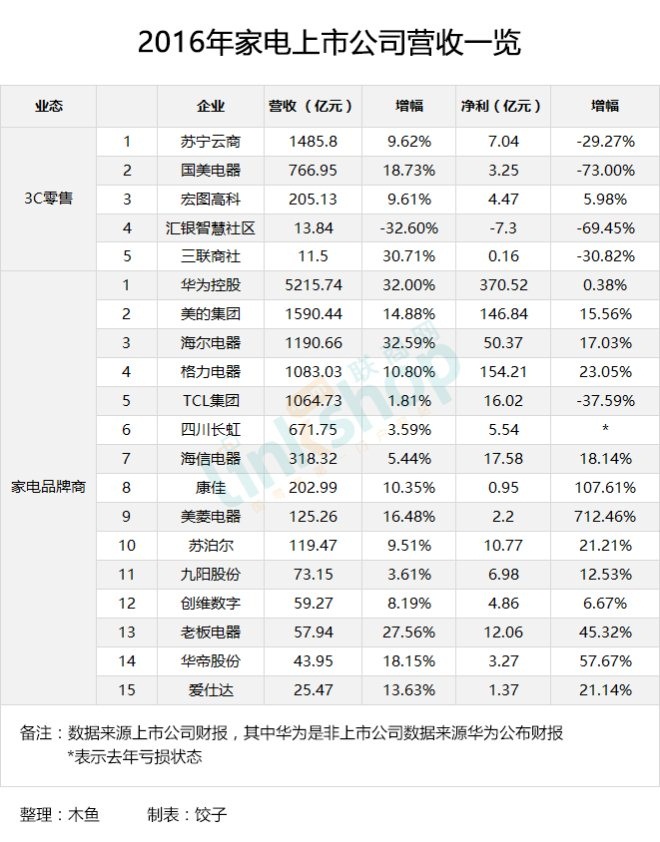近日,《联商网》公布了“2016年零售上市公司百强榜”。榜单中共有5家家电零售企业上榜,这5家企业2016年总营收2483.22亿元,同比增长13.48%。同时,《联商网》又统计整理了15家主要上市家电品牌商获悉,这15家企业2016年总营收1.18万亿元,同比增长27.11%,格力,美的,海尔家电三巨头地位不变。