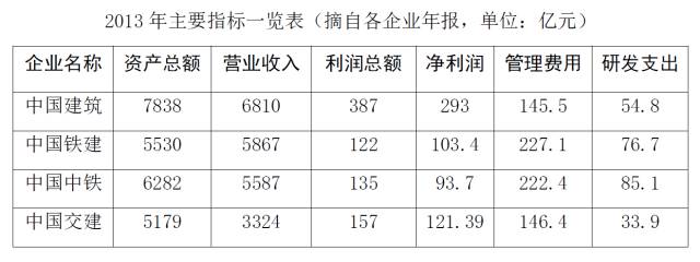 处于价值链最低端的施工管理是我们企业目前的主营业务,企业价值链管理制度偏向于施工管理,想要形成具有竞争力有价值的产品服务流程,现有整体管理流程还存着很多问题。特别是没有开发属于自身知识产权的核心技术,企业科技创新力度不够,尤其是对绿色、环保、BIM等前沿领域探索,进展差强人意。根据各企业发布的年报数据,2013年中国建筑、中国铁建、中国中铁、中国交建研发开支占营业收入比重近2年来有所提高,但远低于国外优秀建筑企业的投入比重。