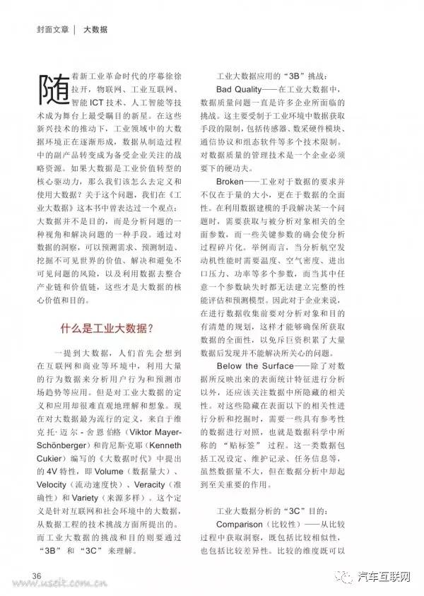 随着新工业革命时代的序幕徐徐拉开,物联网、工业互联网、智能ICT技术、人工智能等技术成为舞台上最受瞩目的新星。在这些新兴技术的推动下,工业领域中的大数据环境正在逐渐形成,数据从制造过程中的副产品转变成为备受企业关注的战略资源。如果大数据是工业价值转型的核心驱动力,那么我们该怎么去定义和使用大数据?关于这个问题,我们在《工业大数据》这本书中曾表达过一个观点:大数据并不是目的,而是分析问题的一种视角和解决问题的一种手段。通过对数据的洞察,可以预测需求、预测制造、挖掘不可见世界的价值、解决和避免不可见问题的风险,以及利用数据去整合产业链和价值链,这些才是大数据的核心价值和目的。一提到大数据,人们首先会想到在互联网和商业等环境中,利用大量的行为数据来分析用户行为和预测市场趋势等应用。但是对工业大数据的定义和应用却很难直观地理解和想象。现在对大数据最为流行的定义,来自于维克托·迈尔-舍恩伯格(Viktor Mayer-Sch?nberger)和肯尼斯·克耶(Kenneth Cukier)编写的《大数据时代》中提出的4V特性,即Volume(数据量大)、Velocity(流动速度快)、Veracity(准确性)和Variety(来源多样)。这个定义是针对互联网和社会环境中的大数据,从数据工程的技术挑战方面所提出的。而工业大数据的挑战和目的则要通过“3B” 和 “3C” 来理解。