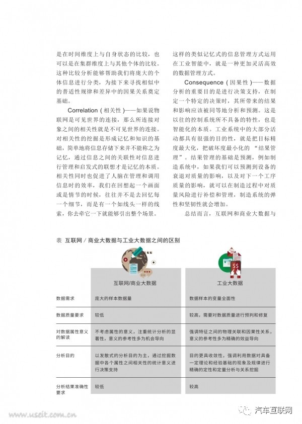 Comparison(比较性)——从比较过程中获取洞察,既包括比较相似性,也包括比较差异性。比较的维度既可以是在时间维度上与自身状态的比较,也可以是在集群维度上与其他个体的比较。这种比较分析能够帮助我们将庞大的个体信息进行分类,为接下来寻找相似中的普适性规律和差异中的因果关系奠定基础。Correlation (相关性)——如果说物联网是可见世界的连接,那么所连接对象之间的相关性就是不可见世界的连接。对相关性的挖掘是形成记忆和知识的基础,简单地将信息存储下来并不能称之为记忆,通过信息之间的关联性对信息进行管理和启发式的联想才是记忆的本质。相关性同时也促进了人脑在管理和调用信息时的效率,我们在回想起一个画面或是情节的时候,往往并不是去回忆每一个细节,而是有一个如线头一样的线索,你去牵它一下就能够引出整个场景。这样的类似记忆式的信息管理方式运用在工业智能中,就是一种更加灵活高效的数据管理方式。Consequence (因果性)——数据分析的重要目的是进行决策支持,在制定一个特定的决策时,其所带来的结果和影响应该被同等地分析和预测。这是以往的控制系统所不具备的特性,也是智能化的本质。工业系统中的大部分活动都具有很强的目的性,就是把目标精度最大化,把破坏度最小化的 “结果管理”。结果管理的基础是预测,例如制造系统中,如果我们可以预测到设备的衰退对质量的影响,以及对下一个工序质量的影响,就可以在制造过程中对质量风险进行补偿和管理,制造系统的弹性和坚韧性就会增加。总结而言,互联网和商业大数据与工业大数据在技术挑战、数据属性和分析目的等方面有很多区别,这也决定了两者技术手段的不同。工业大数据的价值及意义
