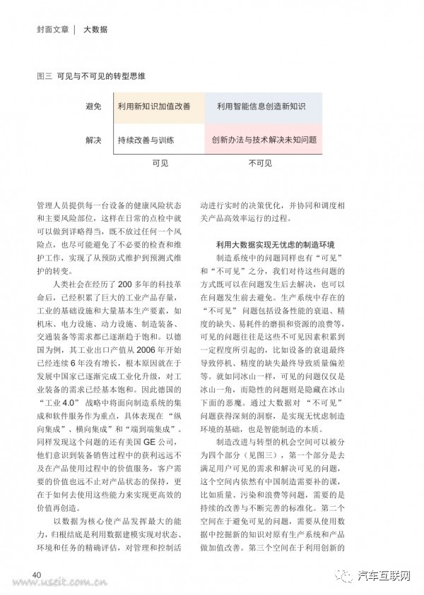 “有之以为利、无之以为用”是出自老子《道德经》中的一句话,其中的智慧放在当今工业的价值模式中依然十分适用。这句话可以理解为:一切事物的实体为我们提供可以凭借的可见的基础条件,而其中所隐藏的空间和可变化的无限可能才是被我们真正使用并创造价值的所在。我们在《工业大数据》一书中,曾用煎蛋模型来阐述产品与服务价值之间的关系(见图一):蛋黄代表的是产品自身,其差异性和客制化程度并不明显,例如一台电视机在挡住了Logo之后就很难被区分出来是哪家公司生产的。而蛋白所代表的增值服务却是差异化和客制化的重要体现,也是企业的品牌和可持续性价值的所在。这些价值存在于用户的使用场景、隐形因素的相关性和产品被制造和使用的全生命周期这些 “不可见世界” 中。数据将成为挖掘这些价值的重要手段,主要体现在:利用数据挖掘在使用中获得新的知识和技术对现有产品进行改进;利用数据去发现和定义用户未知的需求;以数据为媒介向用户提供增值服务。利用大数据实现无忧虑的制造环境有三个方向,数据在每一个阶段中扮演的作用也并不相同。第一个方向是在解决可见问题的过程中积累经验和知识,从而去避免这些问题。在这个过程中,数据可以作为经验和知识的载体。第二个方向是依靠数据去分析问题产生的隐性线索(evidence)、关联性和根原因等,进而利用预测分析将不可见问题显性化,从而实现解决不可见问题的目的。现在的制造系统正在经历从第一个阶段到第二个阶段的转变过程,在完成这个过程后,制造系统将不再有“surprise”,使得所有隐性问题在变成显性问题和影响之前都可以被提前解决。第三个方向是通过对数据的深度挖掘,建立知识和问题之间的相关性,从数据中启发出新的知识,并能够利用知识对制造系统进行精确的建模,产生能够指导制造系统活动的镜像模型,从系统的设计端避免可见及不可见问题的发生。这三个方向对企业都非常具有借鉴意义,但是需要对不同的情况也适用于不同的方向。总地概括,这三个方向分别适用于以下几类情况中问题的解决: