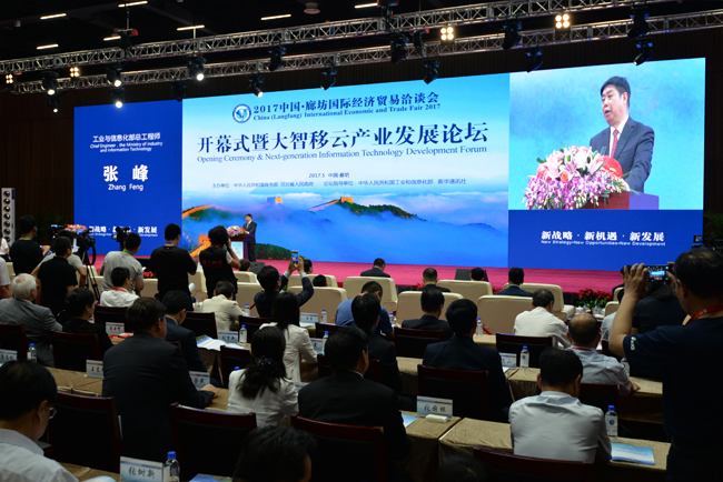 2017年5月18日,工业和信息化部党组成员、总工程师张峰出席2017中国•廊坊国际经济贸易洽谈会“大智移云”产业发展论坛开幕式并致辞。河北省委书记、省人大常委会主任赵克志,省长许勤、省政协主席付志方,商务部等部委有关领导,以及专家、企业家等海内外各界人士参加论坛开幕式。