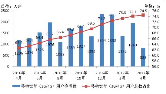 图3 2016-2017年4月移动宽带用户当月净增数和总数占比情况