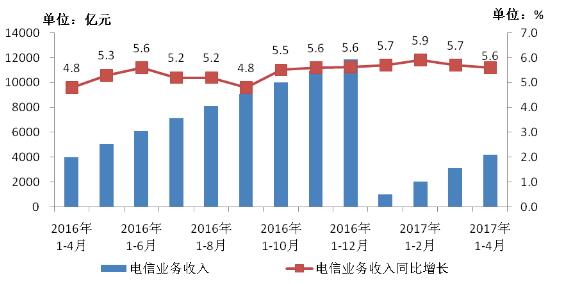 电信业务总量增速稳步提高。2017年4月,电信业务总量完成1878亿元,同比增长56.9%,电信业务收入完成1109亿元,同比增长5.4%。