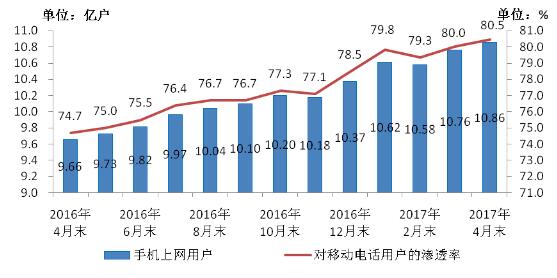图5 2016-2017年4月手机上网用户和对移动电话用户渗透率情况