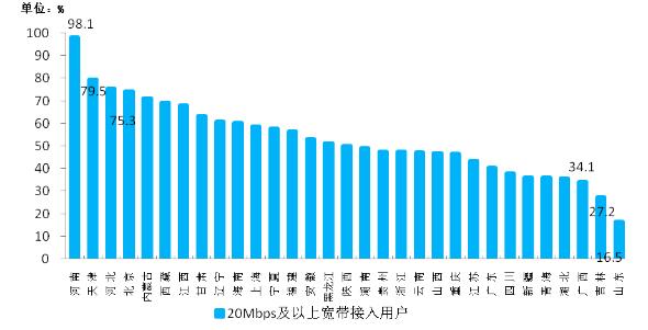 4月末,东、中、西部地区50Mbps及以上宽带接入用户分别达到7590万户、4862万户和3291万户,用户渗透率中部地区领先,达到59.8%,东部、西部地区分别为47.3%和45.2%,各省间50Mbps及以上宽带接入用户占比差异呈缩小态势,河南、天津、河北、北京和内蒙古分别居全国前五位,占比均超过70%。